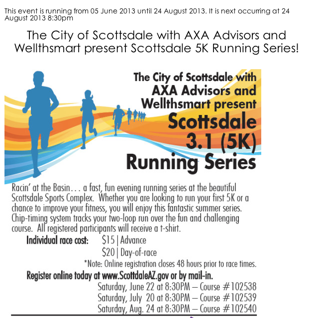 Join the City of Scottsdale for its final installment of Racin’ at the Basin. This is a fast, fun evening running series at the Scottsdale Sports Complex. You don’t have to be an avid runner to join- just do it for fun! With the beautiful McDowell Mountains as your back drop, this 5k is a great chance to improve your fitness and maybe start a new hobby! So grab your friends and neighbors and ask them to join you on Saturday August 24th at 8:30 pm. Register online at ScottsdaleAz.gov or by mail in.