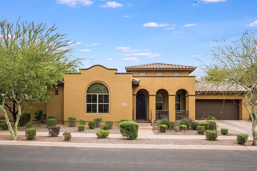 Open Saturday and Sunday 1-4pm. A gorgeous, contemporary 4 bed plus den and bonus room, 3.5 bath DC Ranch home on premium lot with expansive mountain vews. Fully loaded with designer touches throughout, this immaculate, light-filled home is move-in ready. Large, gourmet kitchen is graced with granite counters, extra-large island with sink, gorgeous cabinetry, butler’s pantry. Master suite features a large walk-in closet, double sinks, gorgeous granite counters, tub and shower with stone surround, and connected nursery/exercise room. Extra-large bonus room perfect for playroom or game room. Dream backyard with two patios, sparkling heated pool, spa, outdoor kitchen, dog run, putting green and synthetic grass play area. This open house will be held by Phil Sexton on Saturday and by Jeff Sibbach on Sunday. 17723 N 93rd Place, Scottsdale, AZ 85255